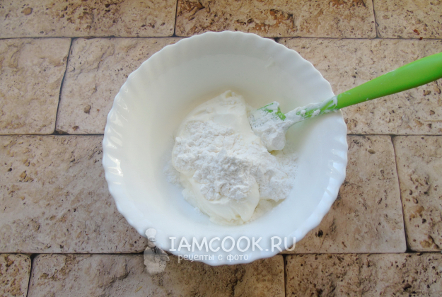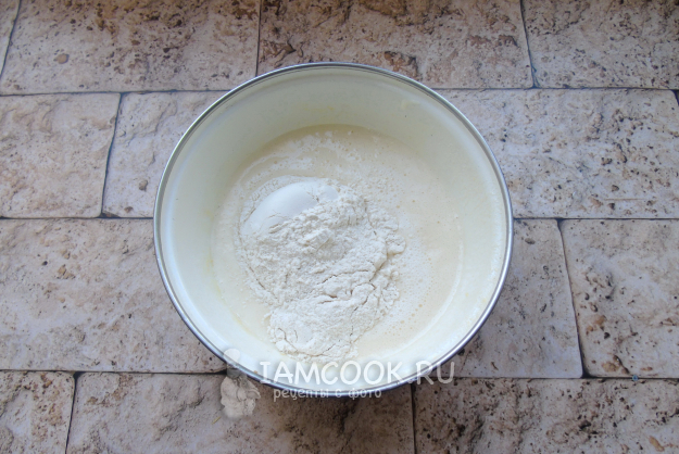 Насыпьте муку и соду, погашенную уксусом или лимонным соком. Перемешайте до однородной консистенции.