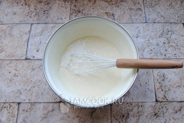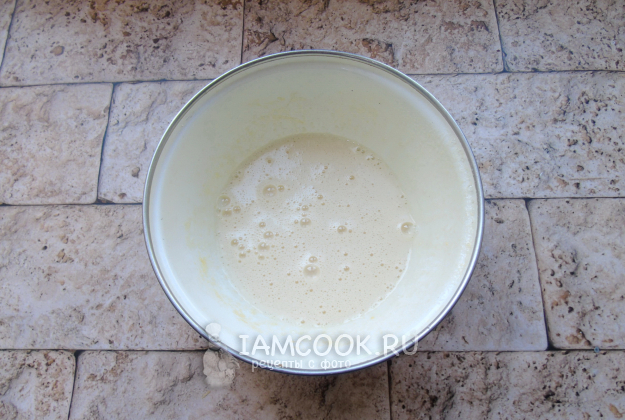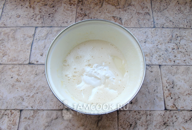 Перемешайте яйца с сахаром, сметану и сгущенное молоко.