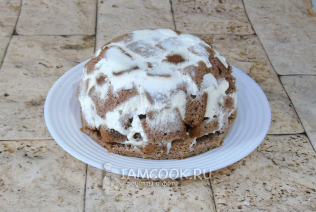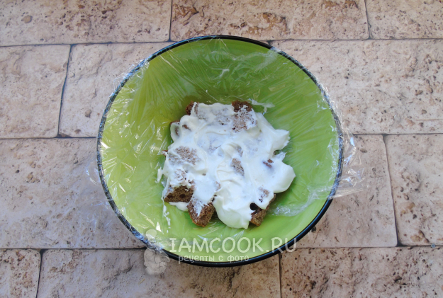 Сборка торта. В глубокую миску постелите пищевую пленку так, чтобы её края свисали. На дно выложите 2 столовые ложки крема и слой кубиков коржа. Покройте кубики слоем крема. Таким образом, чередуя слой крема и кубиков коржа, выложите миску доверху.