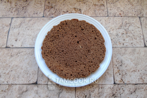 Корж достаньте из формы, остудите и вырежьте тонкий круг, который станет основанием торта.