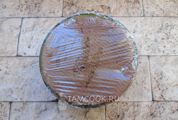 Накройте круглым коржом и пищевой пленкой. Отправьте торт в холод на 7-8 часов, а лучше на ночь.