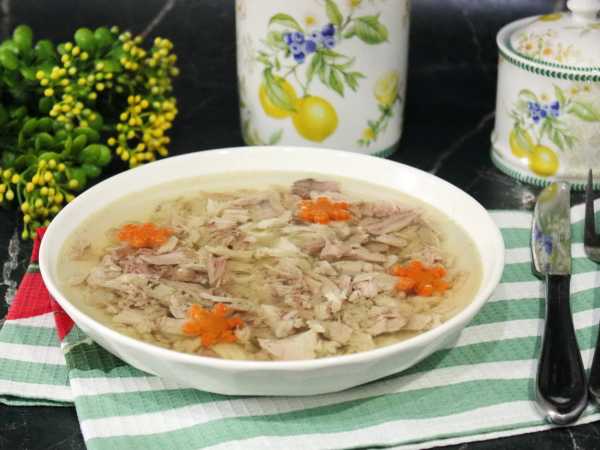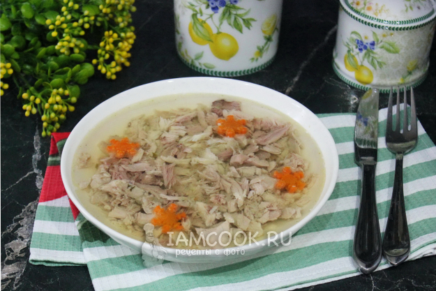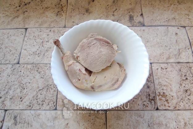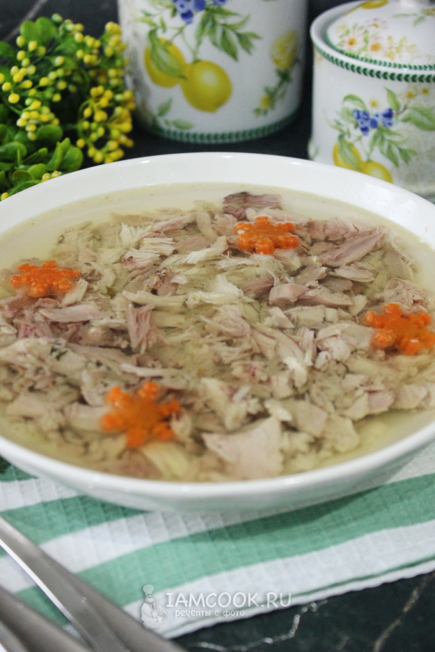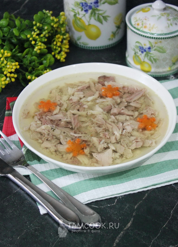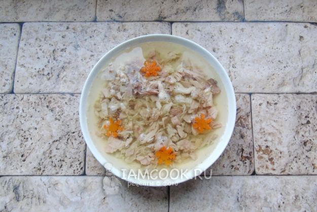 Желатин залейте холодной водой и дайте набухнуть в течение 10-15 минут. Бульон, в котором варились курица и свинина, процедите. Добавьте набухший желатин и хорошо разогрейте, но не кипятите. Постоянно помешивая, полностью растворите желатин.