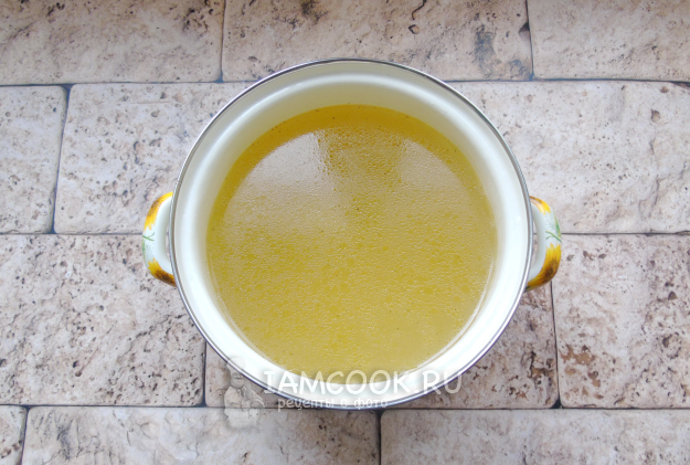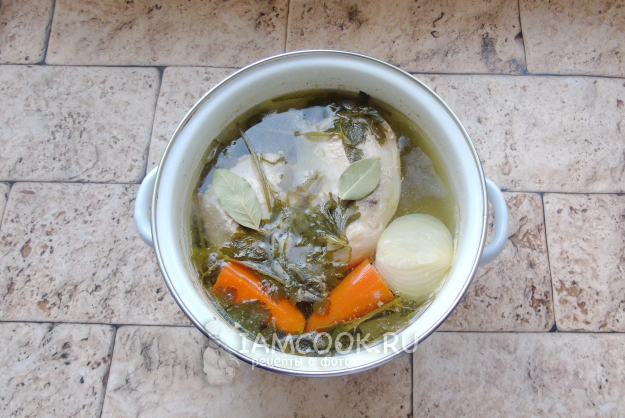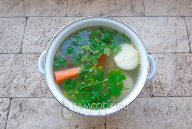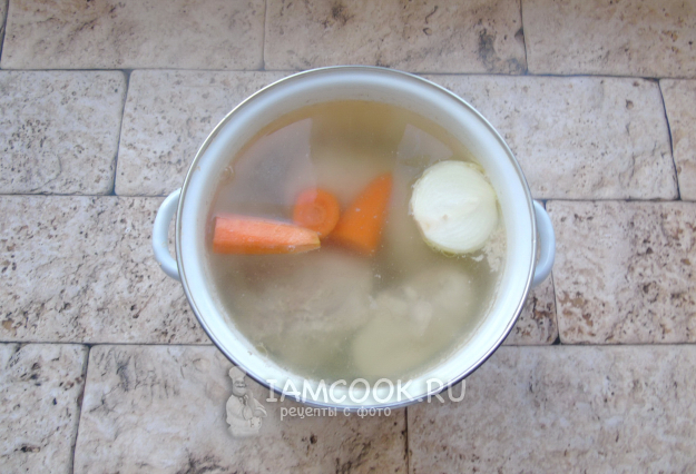 Поставьте кастрюлю на плиту и доведите до кипения. После нагрев уменьшите до минимального и снимите пену. Лук и морковь очистите, помойте и выложите в кастрюлю.