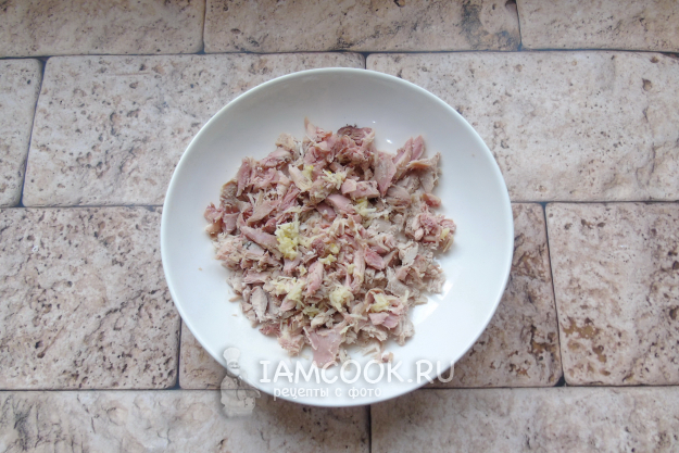 Отварную курицу и свинину мелко нарежьте и разложите по тарелкам. По желанию добавьте измельченный чеснок.