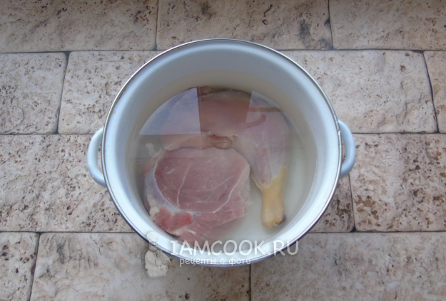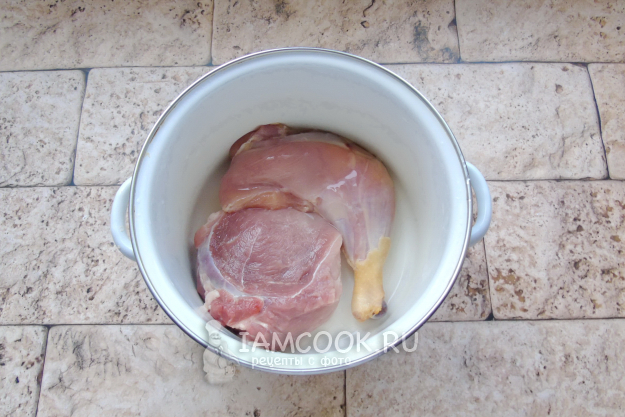 Курицу и свинину помойте, выложите в кастрюлю. Предварительно снимите жирную кожицу у курицы и обрежьте жир у свинины. Заливное должно быть абсолютно прозрачным, без слоя жира, который бывает сверху на застывшем холодце.