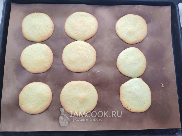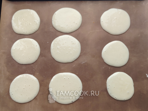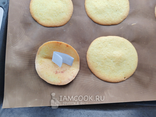 На застеленный пергаментом или тефлоновым ковриком противень ложкой вылить немного теста в форме небольшого круга. Выпекать при температуре 180 градусов около 5-6 минут. Лучше выпекать печенье небольшими партиями, чтобы успеть его подготовить до остывания, иначе тесто затвердеет и печенье не согнется.