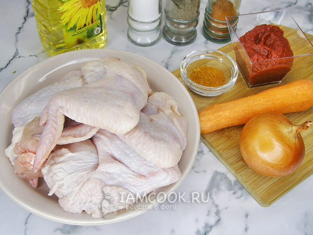 Собираем продукты для приготовления куриных крылышек в томатном соусе на сковороде. Перец можно взять любой, который больше нравится, а можно вообще обойтись без него. Обязательно посмотрите на состав приправы для курицы - если она содержит соль, то солить крылья надо немного или вообще не солить.