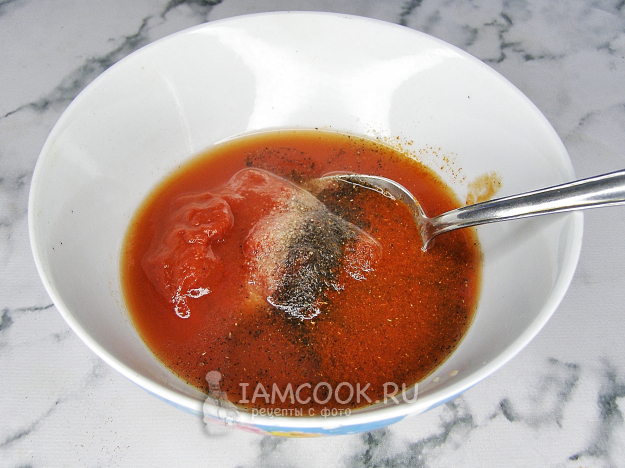 В отдельную мисочку кладём томатную пасту, добавляем соль, примерно 1 чайную ложку, красный и чёрный молотый перцы по вкусу. Добавляем воду и перемешиваем.
