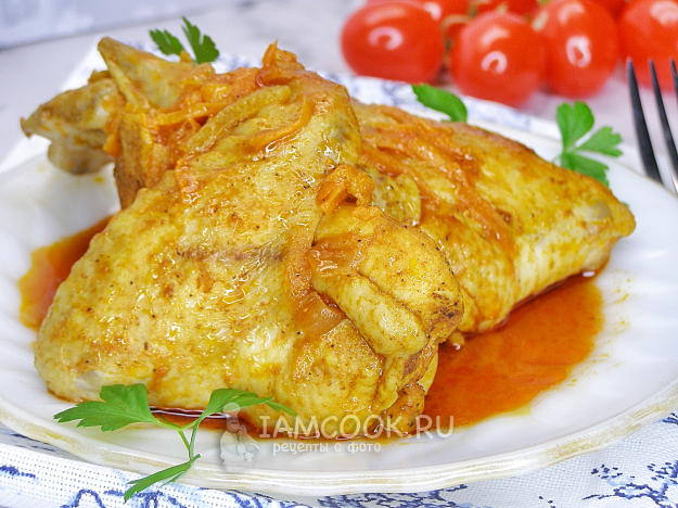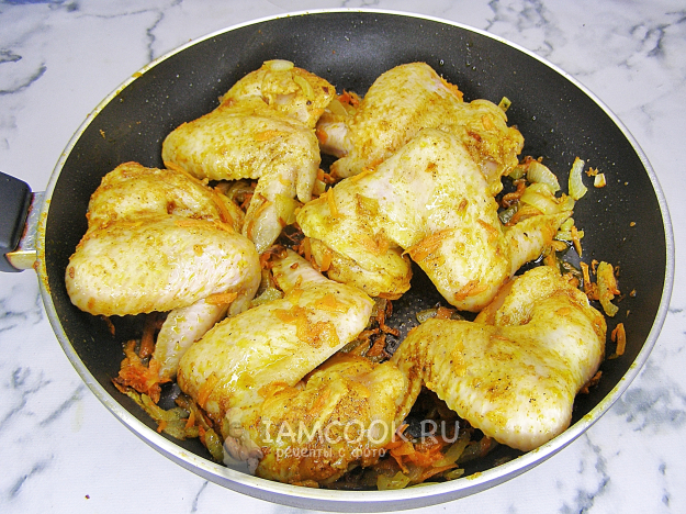 В сковороду с обжаренными овощами выкладываем крылышки и обжариваем их с обеих сторон, периодически переворачивая и перемешивая лук с морковью. На это уйдёт минут 10. Крылышки должны слегка подрумяниться.