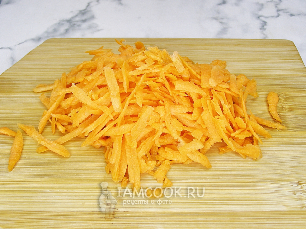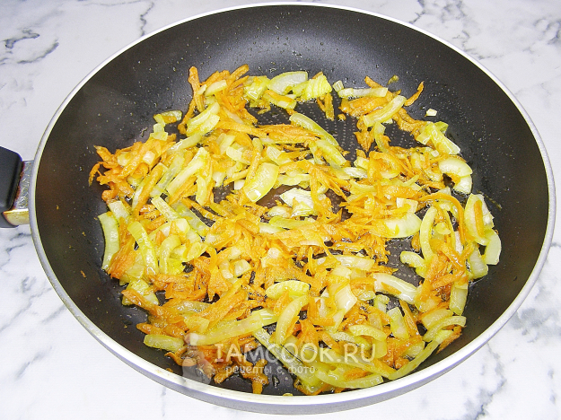 Обжариваем на сковороде, на растительном масле лук и морковь около 5 минут, до мягкости.