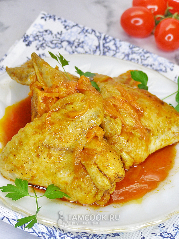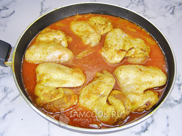Вливаем в сковородку томатную пасту с водой. Если вам кажется, что соуса получилось мало, можно добавить ещё воды. Соус должен покрывать крылышки минимум до половины. Доводим до кипения, затем накрываем сковородку крышкой, уменьшаем огонь почти до минимального и тушим куриные крылышки в томатном соусе на сковороде примерно 20 минут.
