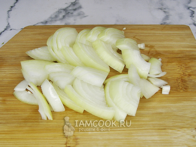 В это время нарезаем лук полукольцами или четверть-кольцами.