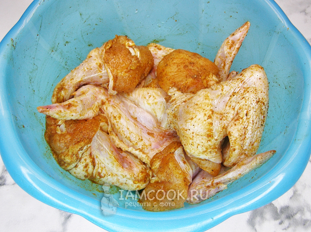 Ополаскиваем крылья прохладной водой и слегка промакиваем их бумажным полотенцем. По желанию можно обрезать крайние фаланги, но я их оставила. Посыпаем крылышки приправой для курицы, слегка солим и перчим по вкусу. Перемешиваем и оставляем ненадолго, чтобы они промариновались.