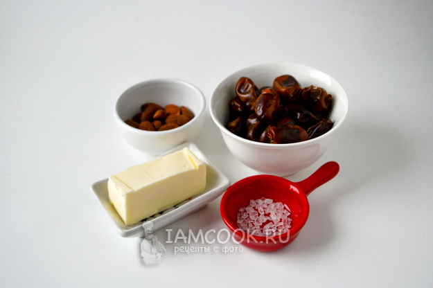 Соберите продукты для приготовления фиников с маслом и орехами. Сливочное масло возьмите вкусное, качественное.