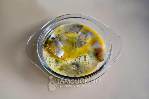Залейте взболтанным яйцом рыбу.
