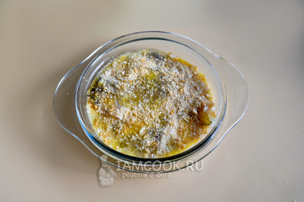 Присыпьте панировочными сухарями. Если нет панировочных сухарей, то просто натрите на терке или измельчите в блендере при помощи насадки металлический нож сухой белый хлеб.
