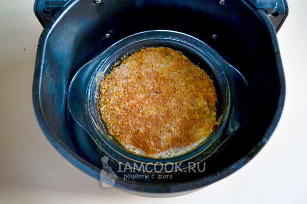 Поставьте форму в чашу аэрогриля, поместите ее в прибор. Установите температуру 170°С, время приготовления - 25-30 минут. Время приготовления будет зависеть от мощности вашего аэрогриля.