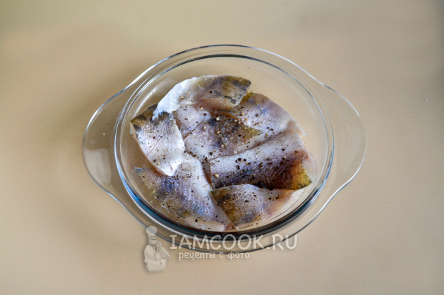 В подходящую для запекания форму положите нарезанные кусочки судака, посолите и поперчите.