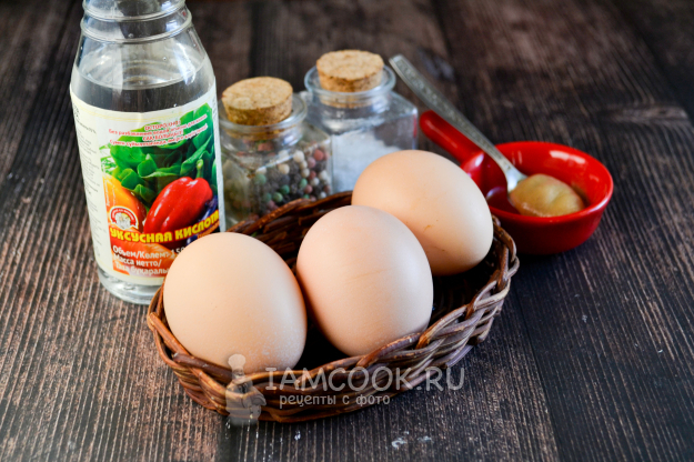 Для приготовления советской закуски Пыж соберите продукты по списку. Яйца сварите вкрутую. Залейте холодной водой.
