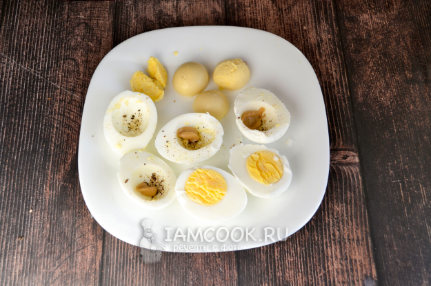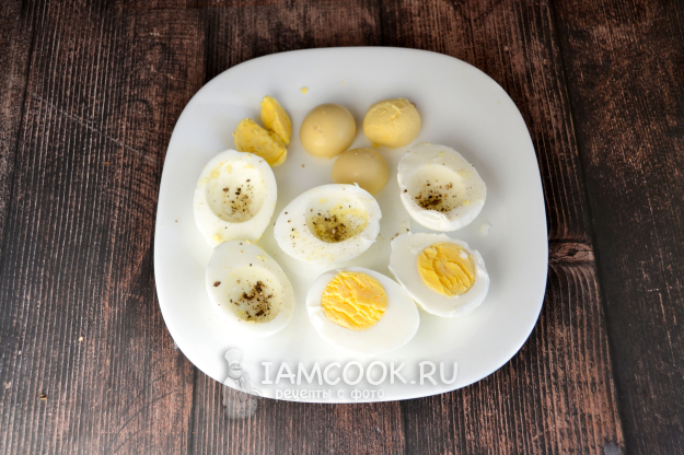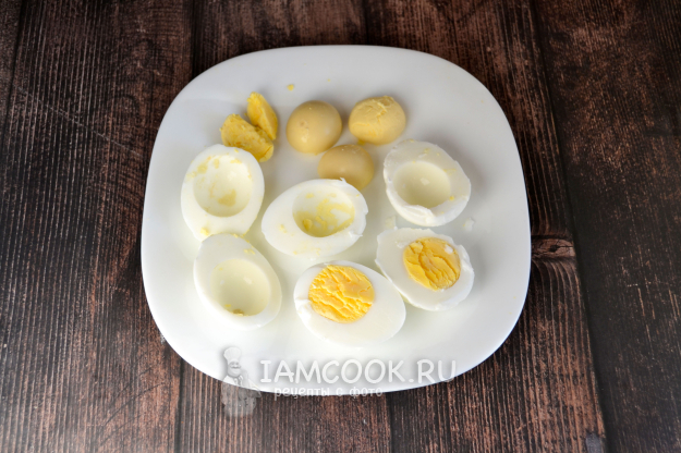 Вареные яйца очистите от скорлупы. Разрежьте яйца пополам вдоль. Аккуратно выньте из половинок желтки.