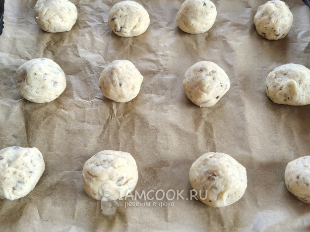 Скатать из теста небольшие шарики, выложить на противень с бумагой для выпечки.