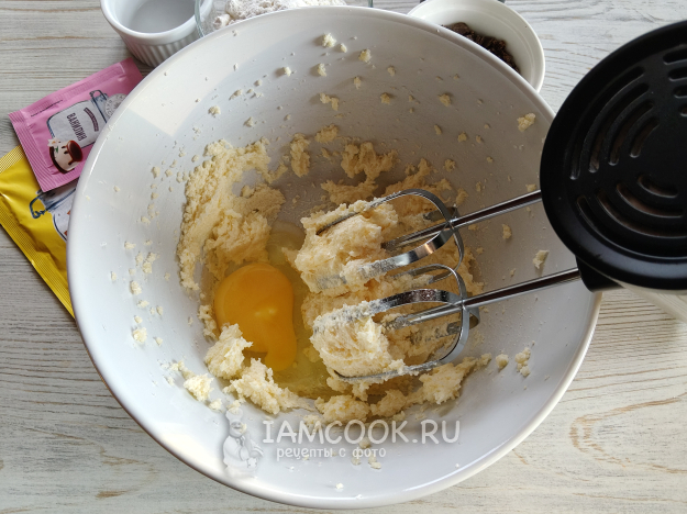 Миксером взбить мягкое масло с сахаром и солью. Добавить яйцо.