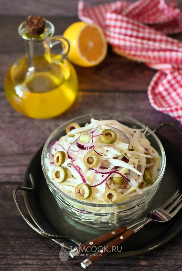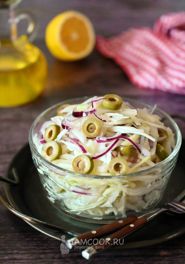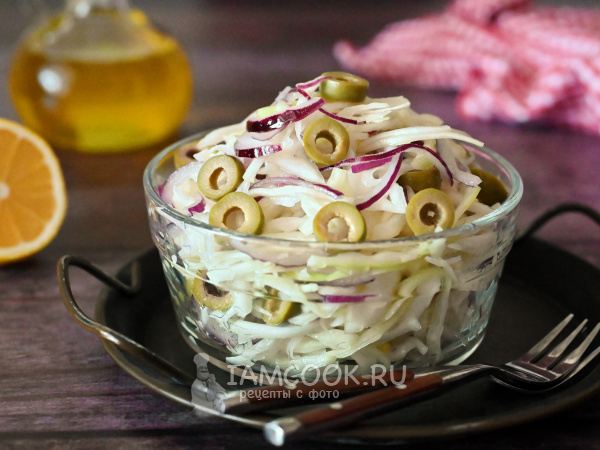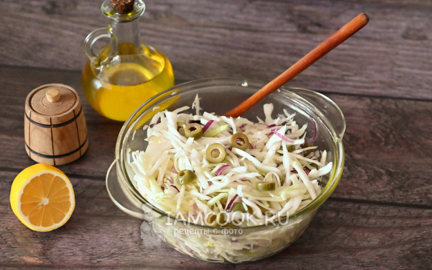 Салат с капустой и оливками перемешайте с маслом, и он готов, можно подавать сразу.