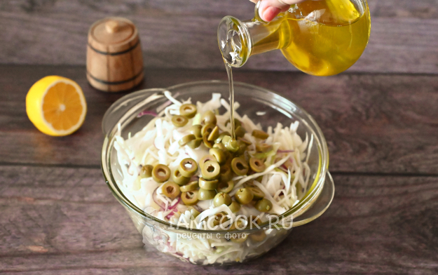 К капусте добавьте нарезанные оливки и полейте салат растительным маслом. Я решила использовать подсолнечное нерафинированное. Также подойдёт оливковое, горчичное, кукурузное или любое, которое посчитаете нужным.