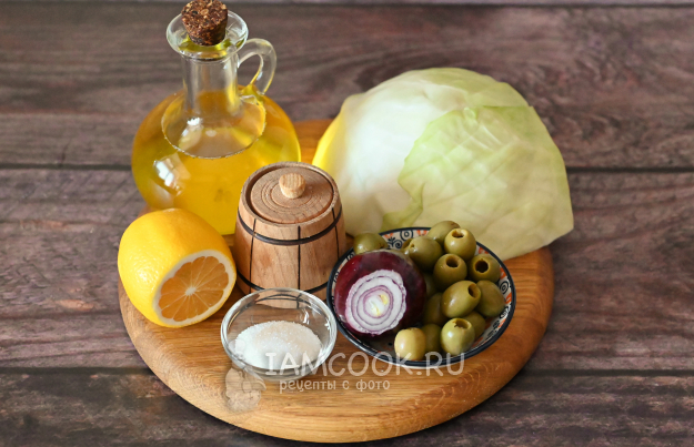 Подготовьте необходимые продукты для салата с капустой и оливками.