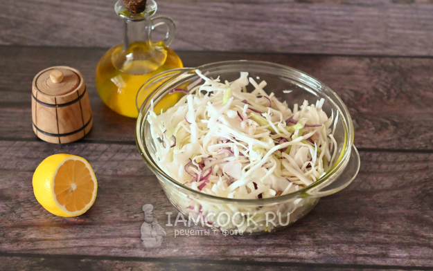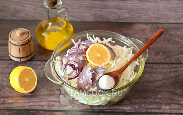 В миску сложите капусту и лук, приправьте солью, сахаром и сбрызните лимонным соком.