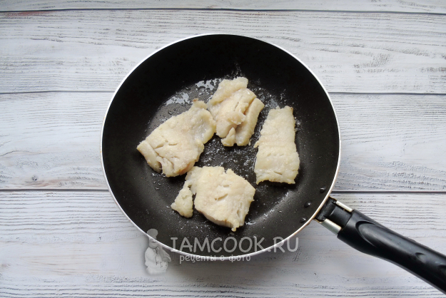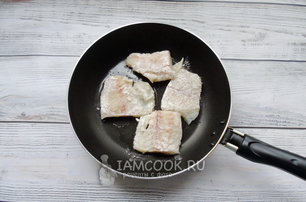 Филе трески посолите, поперчите и обваляйте в муке. Выложите на горячую сковороду с растительным маслом.