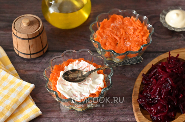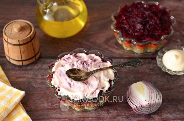 Верхний слой, по классике - натёртая свёкла. Также чуток подсолите и смажьте майонезом.