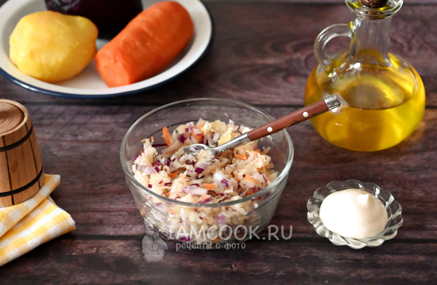 Когда овощи остынут, соберите остальные ингредиенты для приготовления салата «Капуста под шубой».
