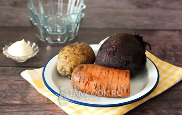 Картошку, морковь и свёклу натрите на крупной тёрке.