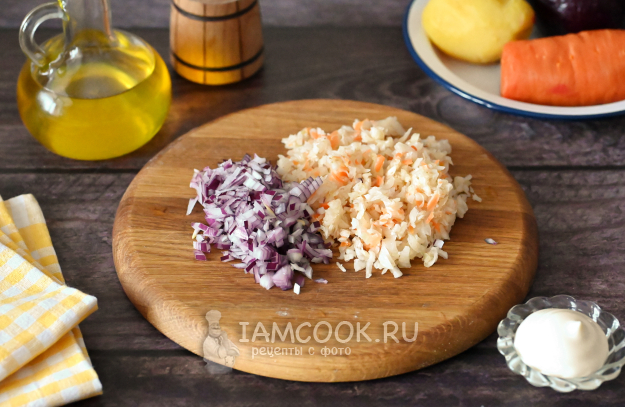 Квашеную капусту отожмите хорошенько от рассола (промывать не нужно) и мелко нарубите. Так же мелко нарежьте красный лук.