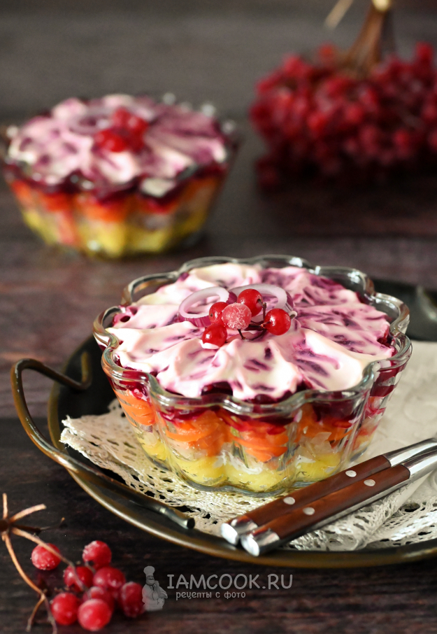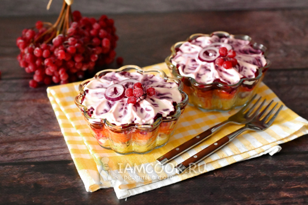 Собирать салат под шубой с капустой можно через кулинарное кольцо, можно в специальной "шубнице" или порционных салатниках, как это сделала я.