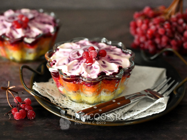 Когда салат «Капуста под шубой» пропитается, он готов и его можно подавать к столу.