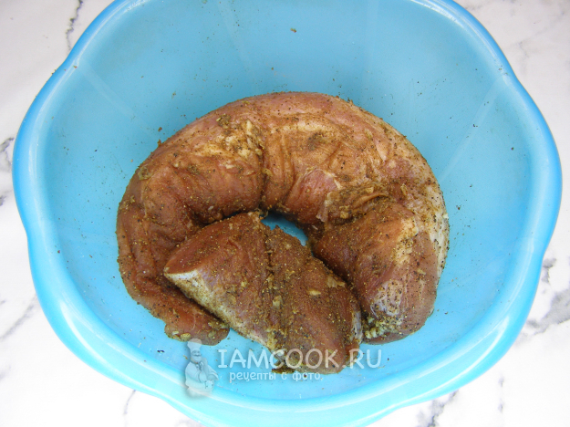 Мясо посыпаем приправой, перцем и солью. Если в приправе содержится соль, то её можно не добавлять или добавить совсем чуть-чуть. Измельчаем прессом чеснок и добавляем его к мясу. Натираем кусок телятины специями и чесноком и оставляем минимум на 2 часа, чтобы мясо впитало ароматы специй.