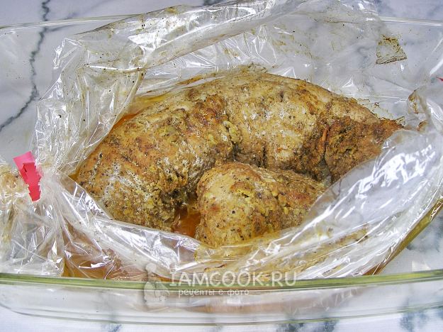 Подготовленное мясо перекладываем в рукав для запекания, крепко его завязываем с обеих сторон и сверху делаем несколько проколов для выхода пара.