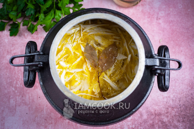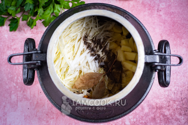 В казан выложите картофель и капусту, добавьте перец черный молотый, соль, лавровые листики.