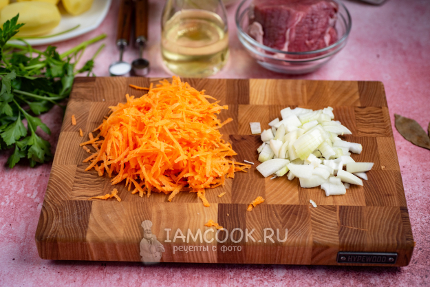 Натрите морковь на крупной терке. Лук репчатый мелко нашинкуйте.