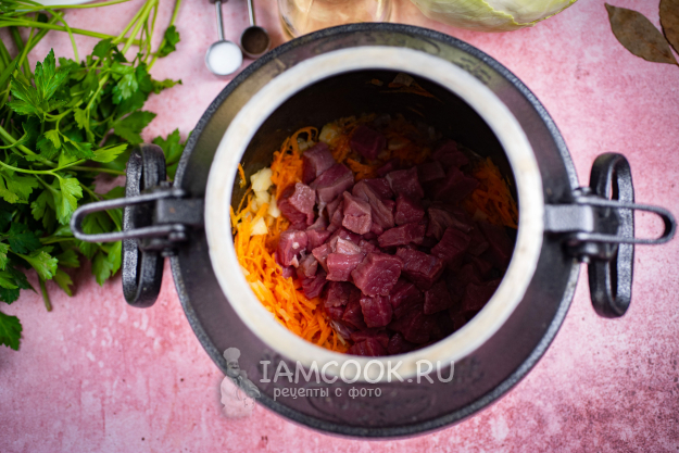 Говядину добавьте к овощам в казан, не снимая казан с огня, продолжайте обжаривать все вместе, помешивая лопаткой, еще 5 минут.