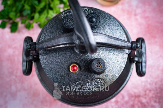 Герметично закройте казан крышкой и увеличьте огонь до максимального уровня. Дождитесь, когда из клапанов пойдет интенсивный пар, и только после этого убавьте огонь до минимального, при этом пар из клапанов все еще должен идти, но не так агрессивно. Готовьте щи с этого момента 35 минут.