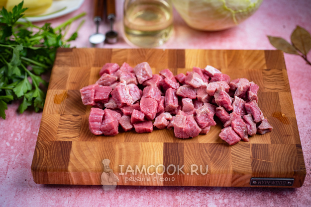 Нарежьте мякоть говядины небольшими кубиками.