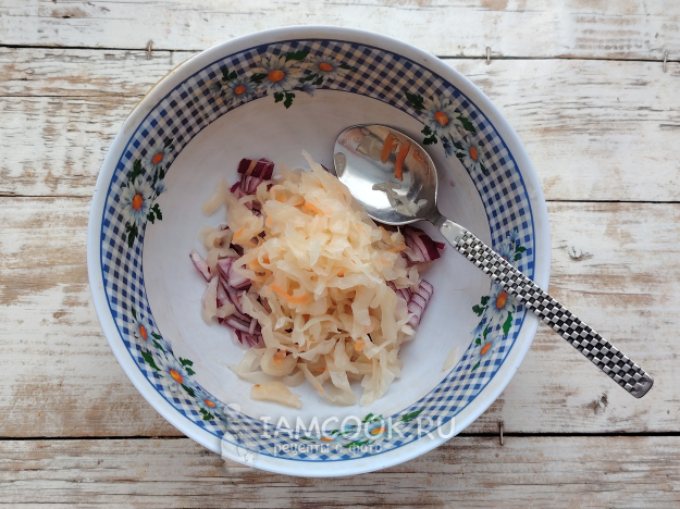 Лук освободить от шелухи, нарезать небольшими кубиками ножом. Добавить квашеную капусту в посуду. Если она кислая, то ее можно предварительно промыть кипяченой холодной водой.