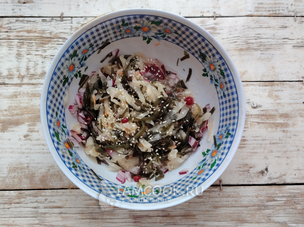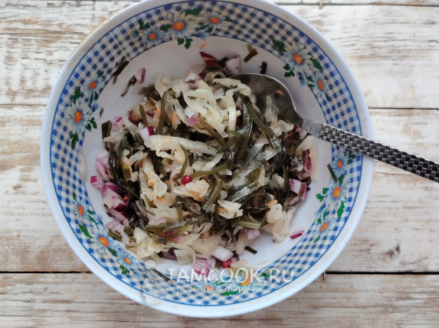 Подать салат из квашеной и морской капусты к столу. Приятного аппетита!