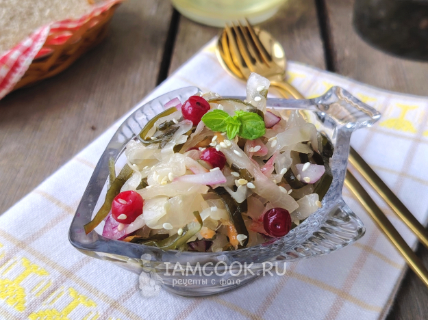Добавить морскую капусту и клюкву. Ягоды можно использовать как свежие, так и замороженные, дав им немного оттаять.