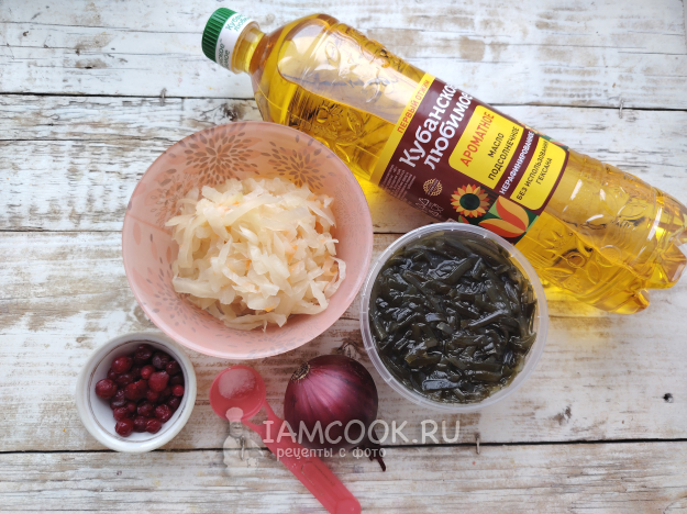 Собрать по списку продукты для салата из квашеной и морской капусты.