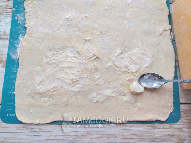 Смазать тесто размягченным сливочным маслом. Если это будет получаться плохо, масло будет оставлять зацепки на тесте. Масло можно растопить в микроволновке и смазать остывшим растопленным.