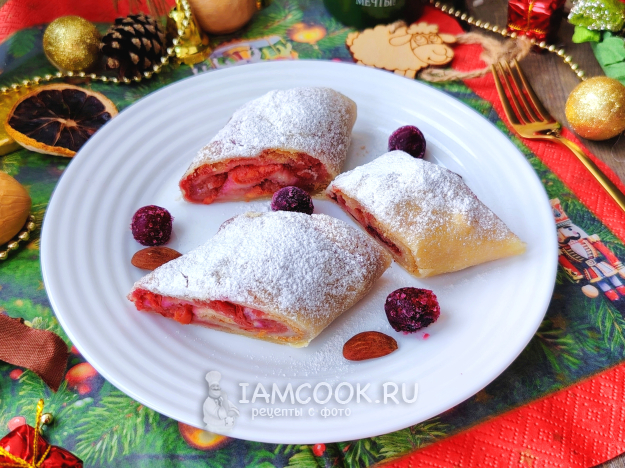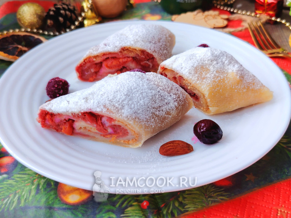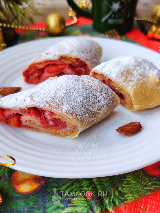Слегка остывший австрийский штрудель с вишней и ванилью присыпать сахарной пудрой и подать к столу с чаем или кофе. Приятного чаепития!
